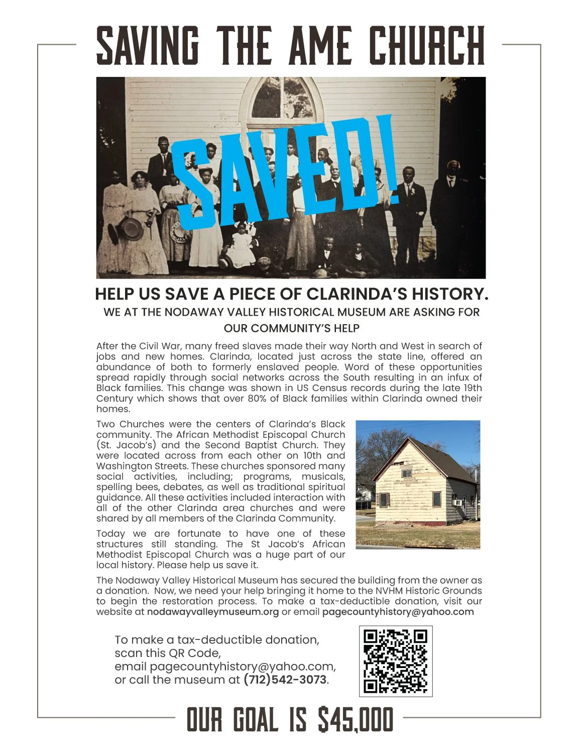 We are proud to share that our historic St. Jacob’s African Methodist Episcopal Church has been saved and moved to the Nodaway Valley Historical Museum grounds. This treasured landmark holds a powerful place in Clarinda’s history—built by a thriving community of formerly enslaved people who came here after the Civil War seeking opportunity, many of whom became proud homeowners and community leaders. St. Jacob’s was one of two vibrant Black churches that served as spiritual and social centers, hosting programs, music, debates, and events shared with the entire town. Today, we are working to restore this remarkable piece of our heritage. Please use the QR code, call, or email to donate—your support will help us bring this historic treasure back to life for future generations.